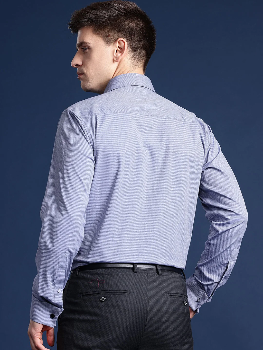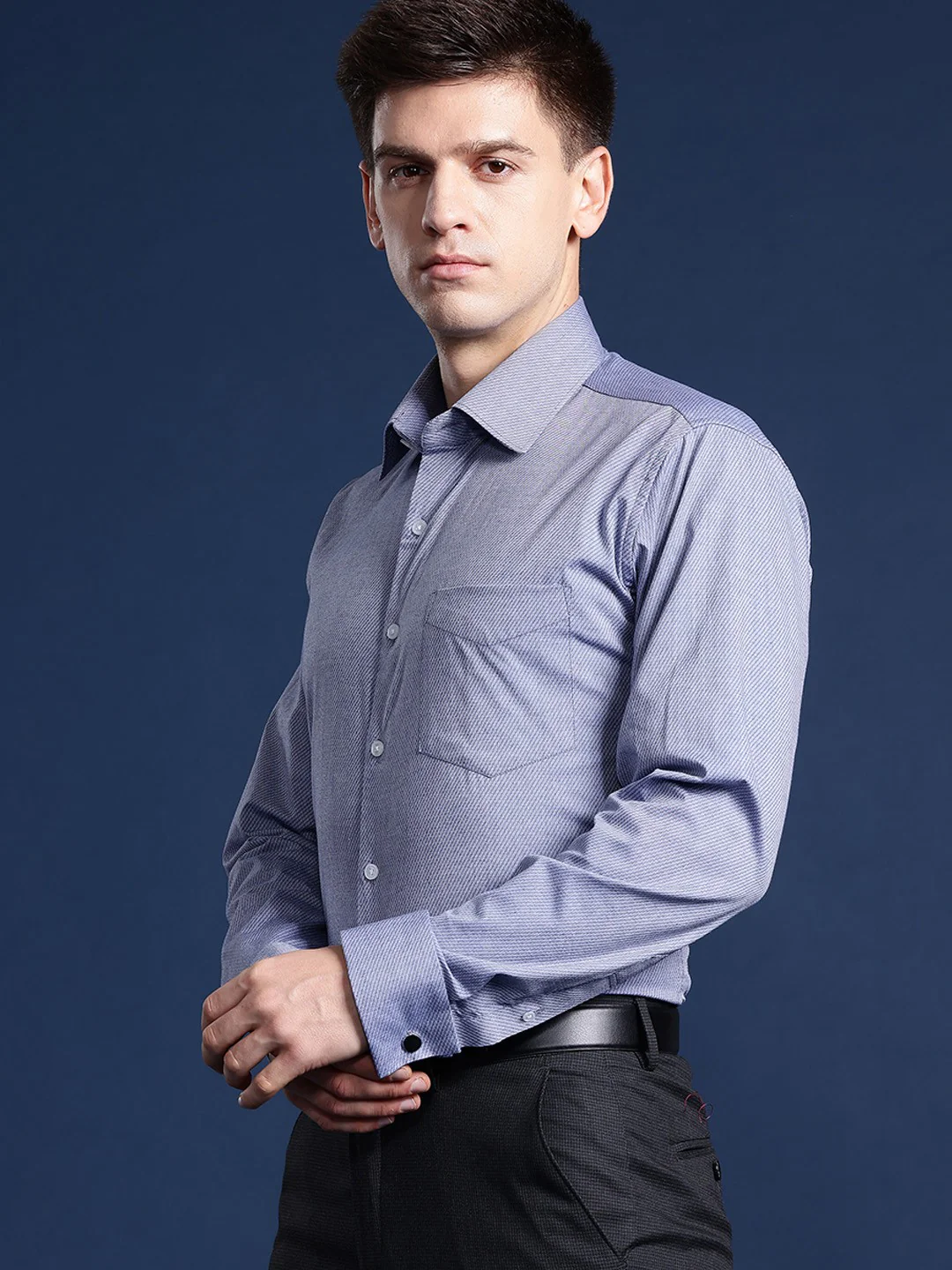 Pair this bluish grey self-design french cuff formal shirt from Hancock made with premium quality cotton dobby with navy blue trousers and black formal shoes for an elegant look.