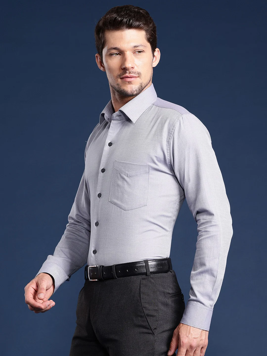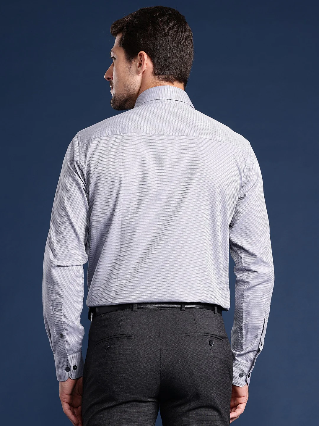 Formalize your wardrobe with this steel grey textured and self-design shirt made with superior quality pure cotton fabric from Hancock with black trousers and black formal shoes for a graceful look.